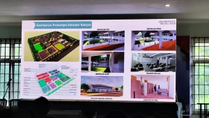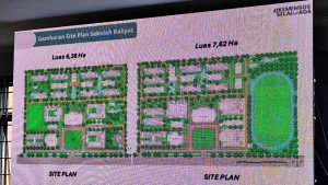 “Lahan yang disiapkan Wali Kota Andi Harun nanti dekat Stadion Palaran. Pindah semua nanti ke sana. Kalau lahannya 7 hektar dapat bangunan seperti sebelah kiri, jika lebih besar akan dapat bangunan yang lebih besar seperti sebelah kanan di gambar ini,” jelas Gus Ipul sembari menunjukkan rancangan di layar presentasi.