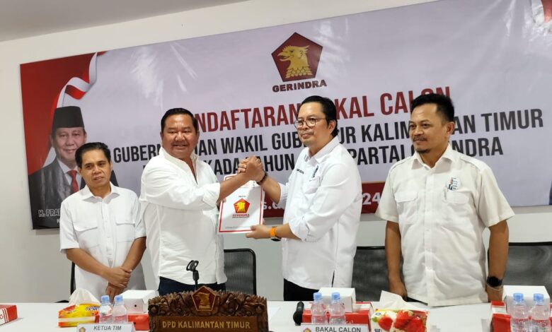 Samarinda, SEKALTIM.CO – Mahyudin, Bakal Calon Gubernur Kalimantan Timur (Kaltim), mengembalikan formulir pendaftaran calon gubernur ke Partai Gerindra pada Rabu siang (22/5/2024).