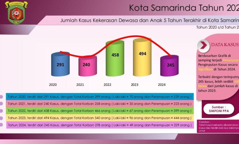 Dilihat dalam laporan yang dirincikan oleh DP3A Kota Samarinda, korban terbagi menjadi dua kategori, yakni anak-anak dan perempuan dewasa. Kasus kekerasan terhadap anak juga memprihatinkan, dengan angka tertinggi pada tahun 2023 sebanyak 189 kasus. Sementara itu, kekerasan terhadap perempuan dewasa mencapai puncaknya pada tahun yang sama, dengan 309 kasus.