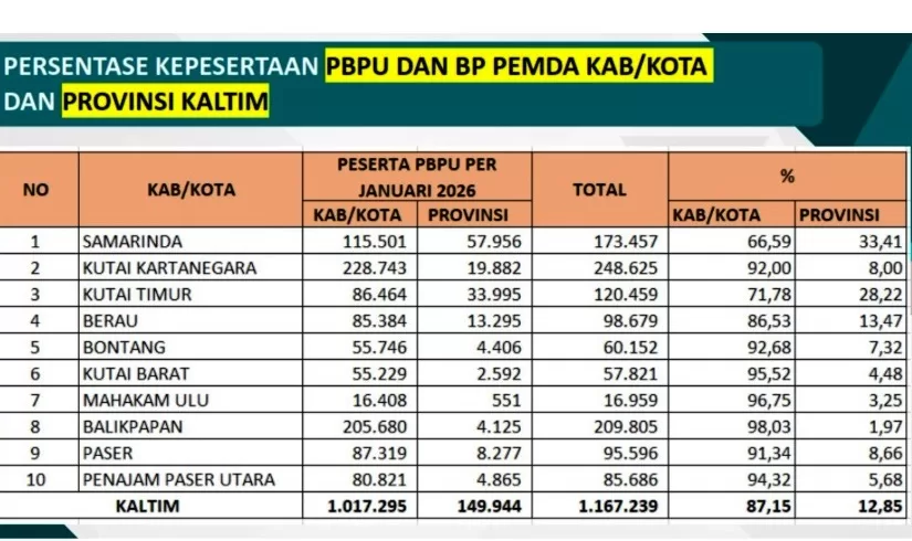 Secara keseluruhan, Dinkes Kaltim mencatat terdapat sekitar 1.167.239 peserta PBPU di seluruh wilayah Kaltim. Dari jumlah tersebut, 1.017.295 jiwa, atau 87,15 persen, ditanggung pemerintah kabupaten/kota. Sementara 12,85 persen, atau 149.944 jiwa, masih menjadi beban Pemerintah Provinsi Kaltim.